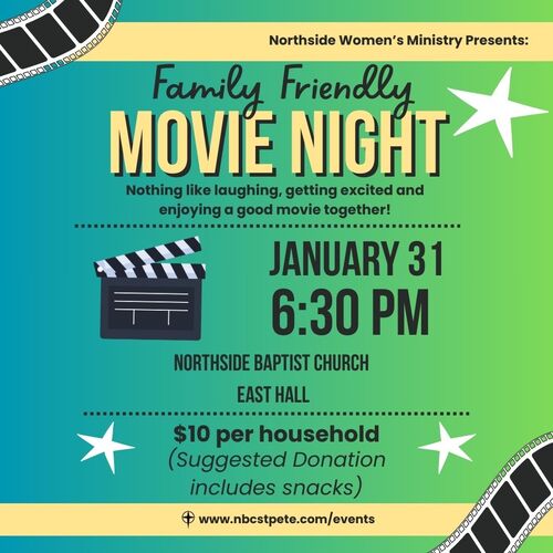 A night of fun for the whole Family! The Northside Women's Ministry invites you to a Family Friendly Movie Night on January 31st at 6:30 PM! We’ll provide the popcorn and drinks—you just bring the family! This is a great opportunity to connect with other families in a relaxed, fun environment. We can't wait to see you there!