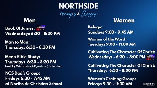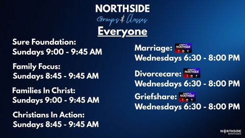 Groups: Groups offer a welcoming space to connect with like-minded individuals, deepen your faith, and make a positive impact. Most groups consist of 6-12 people who meet regularly, either at the Northside Baptist Church campus or in homes. Some Groups offer ongoing studies, which can be joined at any time.